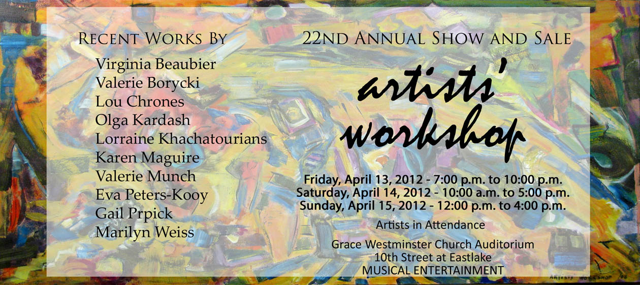 The Artists' Workshop is a group of visual artists juried for membership to ensure the group's artistic quality as well as diversity of style and media. Group members focus on painting and drawing with forays into collage, paper sculpture and mixed media.