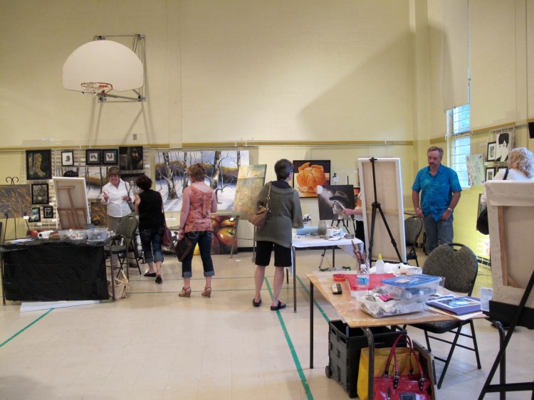 Our group was set up the way we usually do on the Mondays we paint together all winter. The difference was that we had on display around the walls a number of our works. This is different from our show, where we use display panels and each person has one panel to display. Here we hung it on the walls, and sat it on tables, and on the floors. It was very bright and colourful. Many people gave us positive comments on being able to see so much in this open arrangement. (see more photos by going to our flickr site – just over to the right for the link)