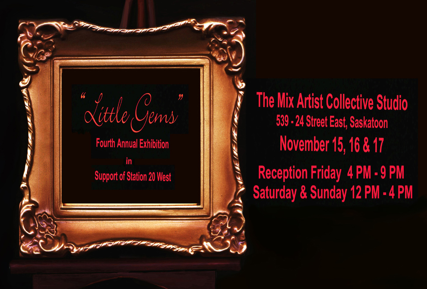 The fourth annual Little Gems show will take place November 15 – 17 at the Mix Artist Collective Studio, 539 24th St East, Saskatoon (little white house behind Knox United Church). This show is free and open to the public.