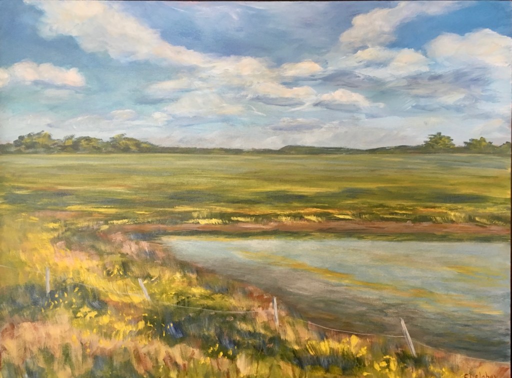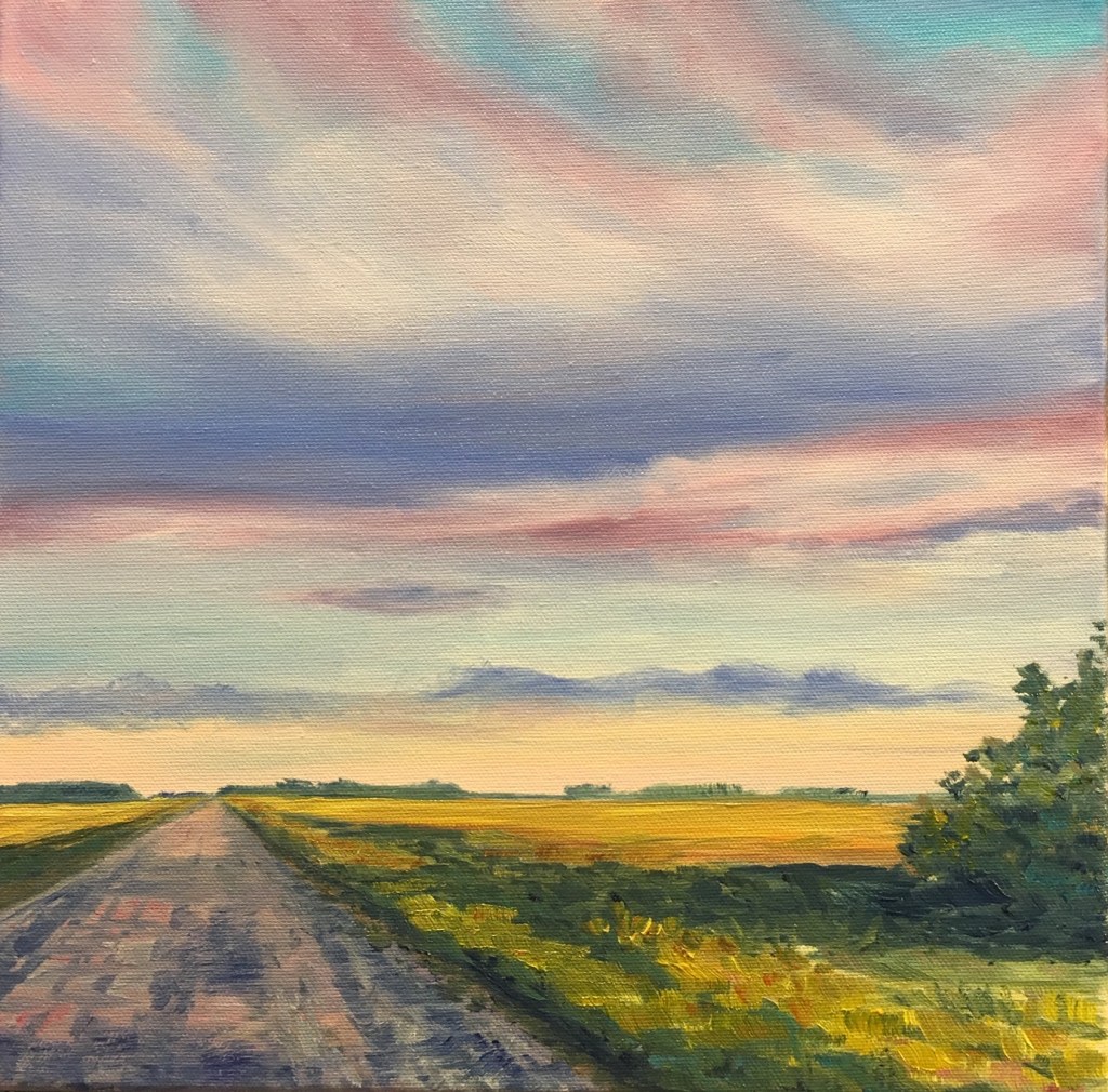 I am particularly attracted to our beautiful prairie scenes, especially clouds, skies, and open roads. I grew up on a farm so I was surrounded by the vast prairie spaces and fields. From the bright blue skies with ever-changing cloud shapes to the incredible jewel-toned sunsets and sparkling lakes, I have a deep desire to recreate it with paint and canvas. I work with acrylic paint and usually large brushes. I really enjoy painting with deep, bold colours and try to instil my appreciation of the prairie land with my colour choices and depiction of the landscape, whether realistically or impressionistically. When I paint, I get lost in the moment and am always surprised to see that many hours have passed. It’s not all wine and roses, sometimes there are many thorns, but each success and failure adds to the artistic journey. I am grateful to have the means to travel down this road.