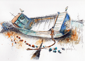 I’ve been attracted to UK artist Ian Fennelly’s interesting use of line and intrigued by the choices he makes about where to use color and where to leave things white. Working on this study of a boat on the shore required patience, but the outcome was worth it.