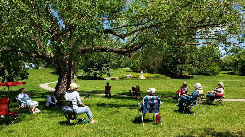 For many of us, the structure of our weekly sessions, culminating in our annual show, helps us keep making art. Our commitment to the group motivates us to show up every Monday rather than letting other things get in the way. And when one’s creative juices are running low, being in the midst of other artists is a great way to get them flowing again. We enjoy being together so much that in the past few summers we’ve organized regular ‘garden painting’ sessions in each other’s back yards.