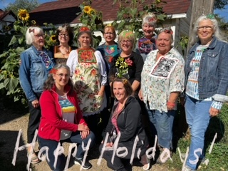 The limericks were written on the back of a group photo she had enlarged and enhanced. Kathleen doctored our shirt fronts with images that reflected our individual artistic styles and added festive hairpieces as well. You’ll find the image that Kathleen reworked at the end of this message.