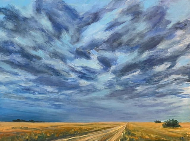 I paint to depict the play of light and shadow over the rolling fields, the endless horizon, the intricate patterns of the land, and the stunning skies. Color is key in prairie landscape painting—whether it’s the billowing white clouds, the golden yellow of a canola field, or the deep blues and greys of an approaching storm. These pictures are deeply ingrained in my mind and soul. My desire to paint big skies and landscapes is about my relationship with the land, and the joy I feel when paintings these familiar places.Other words to describe synergy are partnership, cooperation, kinship, and teamwork. These are also words we can identify with in our group because when we create together or prepare for a show, all of these pieces become part of our art making.