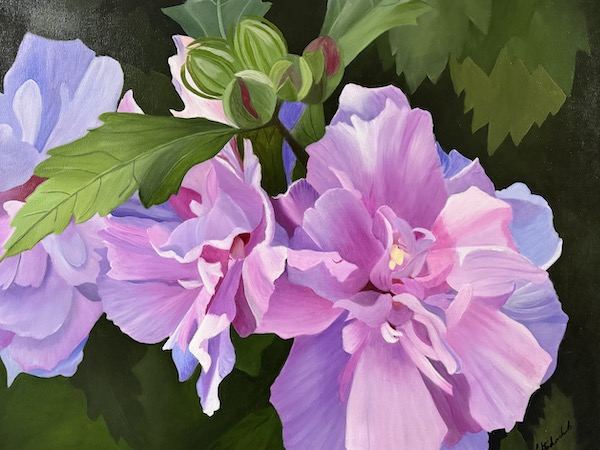 Every now and then I see a completed painting in my mind’s eye. Sometimes I have to I set about developing the skills I need to complete it. The first time this happened was in 1999 when I saw 4 or 5 square pieces in a row of peonies, dahlias, and begonias. It was both exciting and terrifying, but it was the start of a long and enjoyable process. Every now and then I wander into landscape territory, but I’ve been painting mostly florals since 1999.
