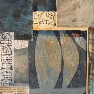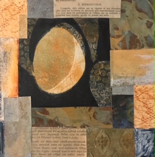 I especially enjoy creating mixed media collages, because I can upcycle materials that have served their original purpose–old books, letters, unsuccessful paintings, postage stamps, packaging—rather than use new materials.