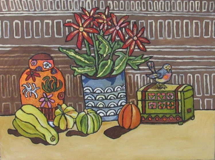 What excites me most when I am painting is colour and how colours create a mood or a feeling. I love working with black gesso and will start a painting by drawing in white on the black. I developed my style of painting when experimenting with different mediums and combining them with gilding. I wanted to change the underlying texture to create an interesting surface. I am happy when my paintings remind me of a wood block print or a piece of tapestry.